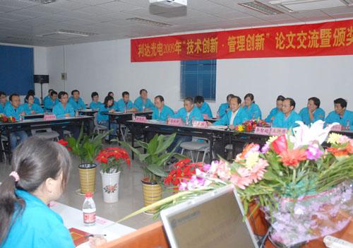 ??????? 深秋時(shí)節(jié),正當(dāng)公司廣大干群以百倍的努力,昂揚(yáng)的精神狀態(tài),投入到大干一百天,全力沖刺年度經(jīng)營目標(biāo)的關(guān)鍵時(shí)刻,10月30日晚,利達(dá)光電舉辦了2009年“技術(shù)創(chuàng)新?管理創(chuàng)新”論文交流暨表彰大會(huì)。利達(dá)公司中高層管理人員,公司科技和技能帶頭人,各單位技術(shù)主管和骨干80余人濟(jì)濟(jì)一堂,相互切磋技藝,共享交流成果,以達(dá)到用科學(xué)發(fā)展的思路,提升利達(dá)技術(shù)?管理創(chuàng)新能力,培育創(chuàng)新文化,打造核心競爭力,推動(dòng)公司產(chǎn)業(yè)升級(jí)進(jìn)而促進(jìn)年度經(jīng)營目標(biāo)實(shí)現(xiàn)的目的。活動(dòng)由利達(dá)公司副總經(jīng)理李智超主持。集團(tuán)公司紀(jì)委副書記胡旭東應(yīng)邀參加了會(huì)議。