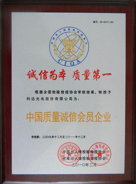 利達(dá)光電股份有限公司榮獲首批“中國質(zhì)量誠信會(huì)員企業(yè)”榮譽(yù)稱號(hào)