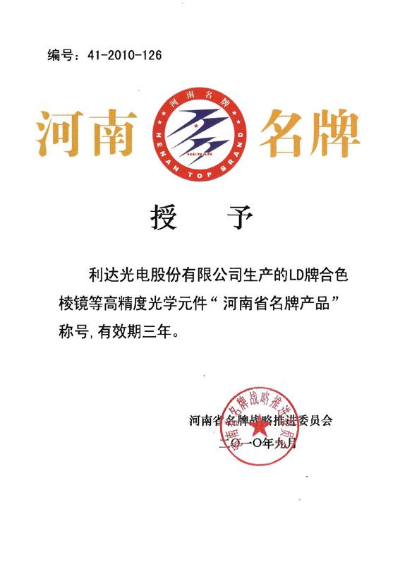 ??????? 近日,公司生產(chǎn)的LD牌合色棱鏡等高精度光學(xué)元件榮獲“河南省名牌產(chǎn)品”的稱號(hào),這是繼2009年公司榮獲河南省優(yōu)質(zhì)產(chǎn)品之后取得的又一榮譽(yù)。