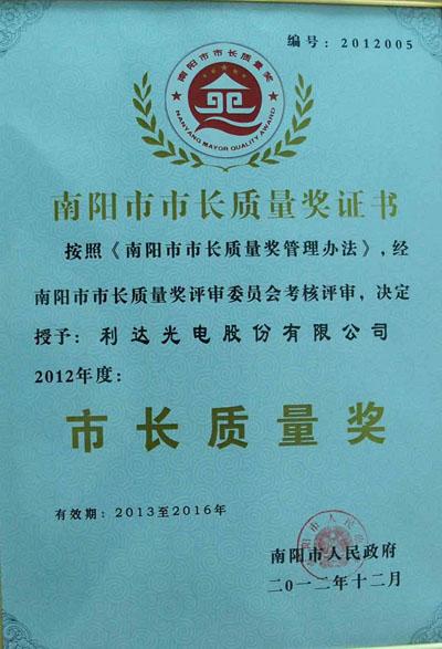 利達(dá)光電榮獲2012年度南陽市“市長(zhǎng)質(zhì)量獎(jiǎng)”