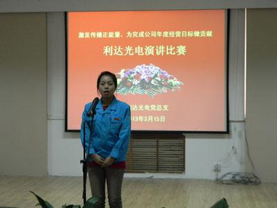 ??????? 為深入學習貫徹利達公司2013年經(jīng)營工作會議精神,進一步明確發(fā)展目標,統(tǒng)一全員思想,激發(fā)傳播正能量,推動公司自我變革活動,在春暖花開、充滿希望的季節(jié),利達光電黨總支舉辦“激發(fā)傳播正能量,為完成公司2013年經(jīng)營目標做貢獻”演講比賽活動。
